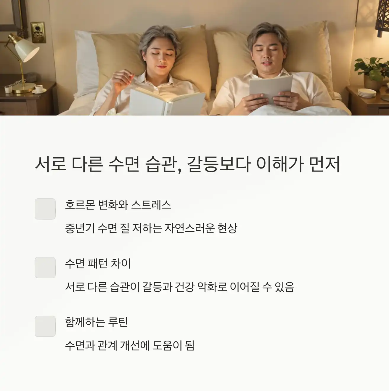 💡 TIP: 갈등을 피하려고 따로 자는 것도 방법이지만, 함께하는 루틴 조절은 수면뿐만 아니라 관계 개선에도 큰 도움이 됩니다.